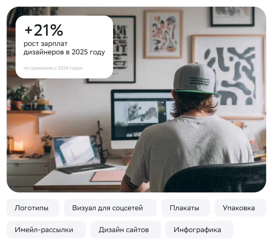 Освоите программы линейки Adobe, Tilda, Figma и нейросети для дизайна, соберёте портфолио из проектов от Детского мира и Самолета и сможете начать карьеру в творческой профессии