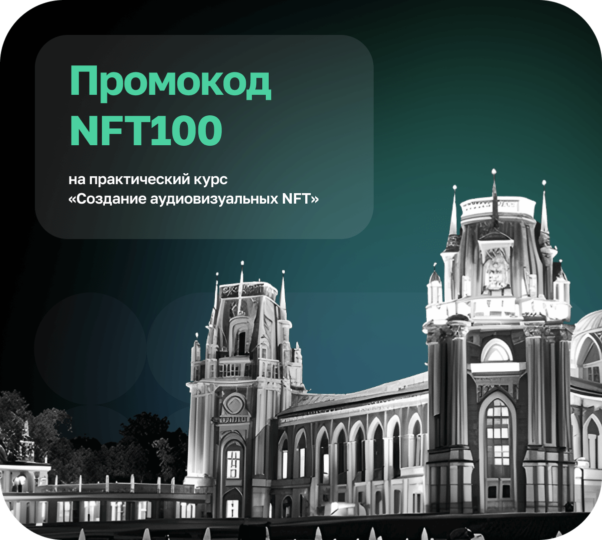 На практическом курсе «Конструирование аудиовизуальных NFT» вы с нуля создадите цифровое произведение искусства. Введите промокод NFT100 в форме оплаты — и курс для вас будет бесплатным.