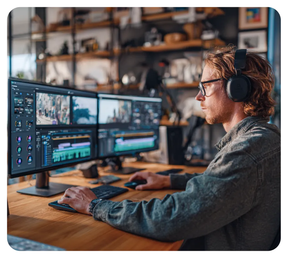 Освоите Premiere Pro, After Effects, Audition и DaVinci Resolve для работы с визуальными эффектами, цветом и звуком